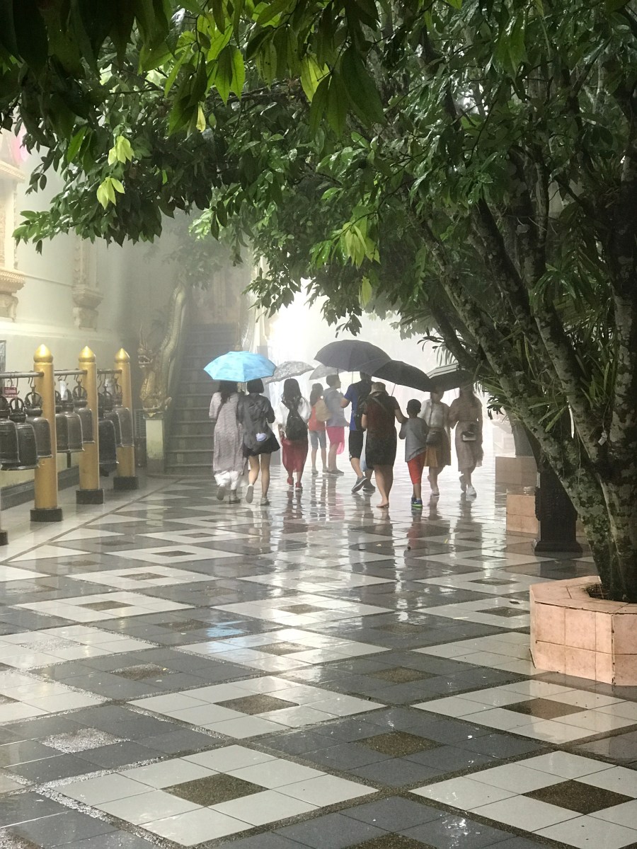 Le wat Doi Suthep est situé à une quinzaine de km de Chiang Mai et les taxis collectifs vous y amèneront pour 30 THB par personne. Ce temple est accessible par un escalier de 309 marches dont on dit que le couple qui les montera à pied, en se tenant par la main, ne se séparera jamais. Aujourd’hui, un funiculaire permet d’accéder au temple sans se fatiguer moyennant la somme de 50 THB par personne : il n’y a pas de petits profils. Malchance ce jour là, nous avons visité ce temple sous une mousson battante et la visibilité était quasi nulle. alors que de la terrasse qui jouxte l’ensemble du temple offre un superbe panorama sur la ville de Chiang Mai située en contrebas.