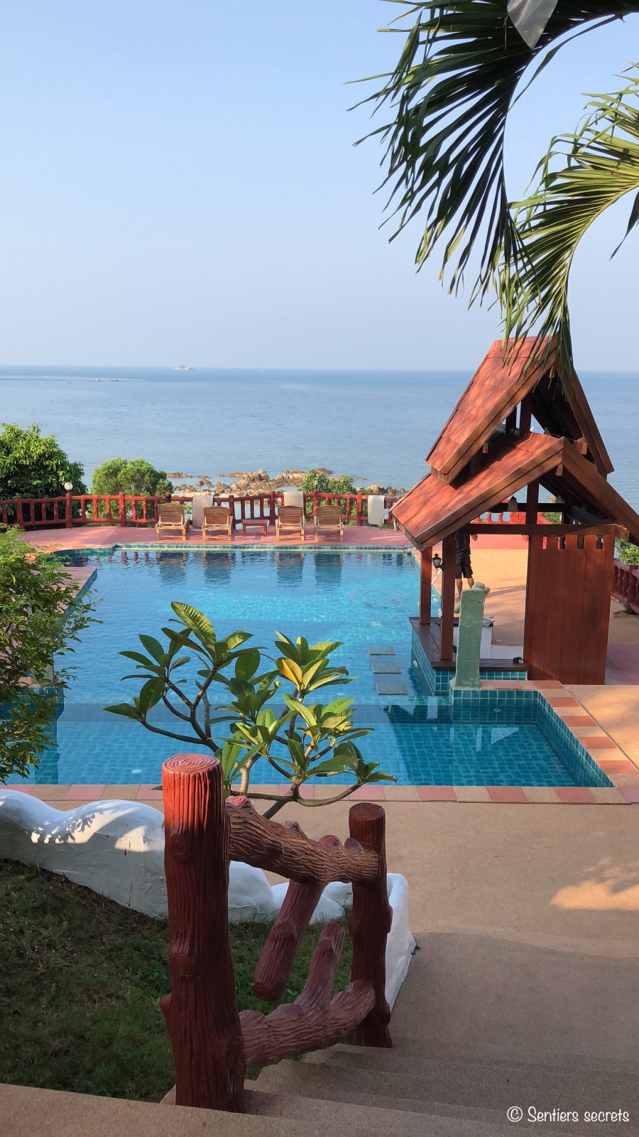 Que faire à Phangan ? Cette ile est une carte postale et on y vit dans un paysage de rêve. Par contre, à part la plage, il n’y a rien à faire, pas de « vieilles pierres » ni de temples à visiter; il y a quelques rares beaux points de vue mais c’est tout. Cette ile est faite pour se ressourcer et passer quelques jours à lézarder sur le sable. Je ne vous conseillerai pas de restaurant, non pas qu’il n’y en ait pas de bons mais simplement car ils peuvent changer de propriétaires, de carte à chaque saison. J’ai fait confiance au personnel de l’hôtel, en leur expliquant que je ne souhaitais pas manger « farang » (occidental) mais thaï et j’ai été bien inspiré de les écouter. Un endroit vaut quand même le détour c’est Bluerama : Ici, c’est le point de vue qui est privilégié, une vue superbe vers l’ouest, quand le soleil se couche. L’endroit se mérite. Certains scooters et quelques voitures sont incapables de grimper la route escarpée qui y mène mais le résultat en vaut la peine.