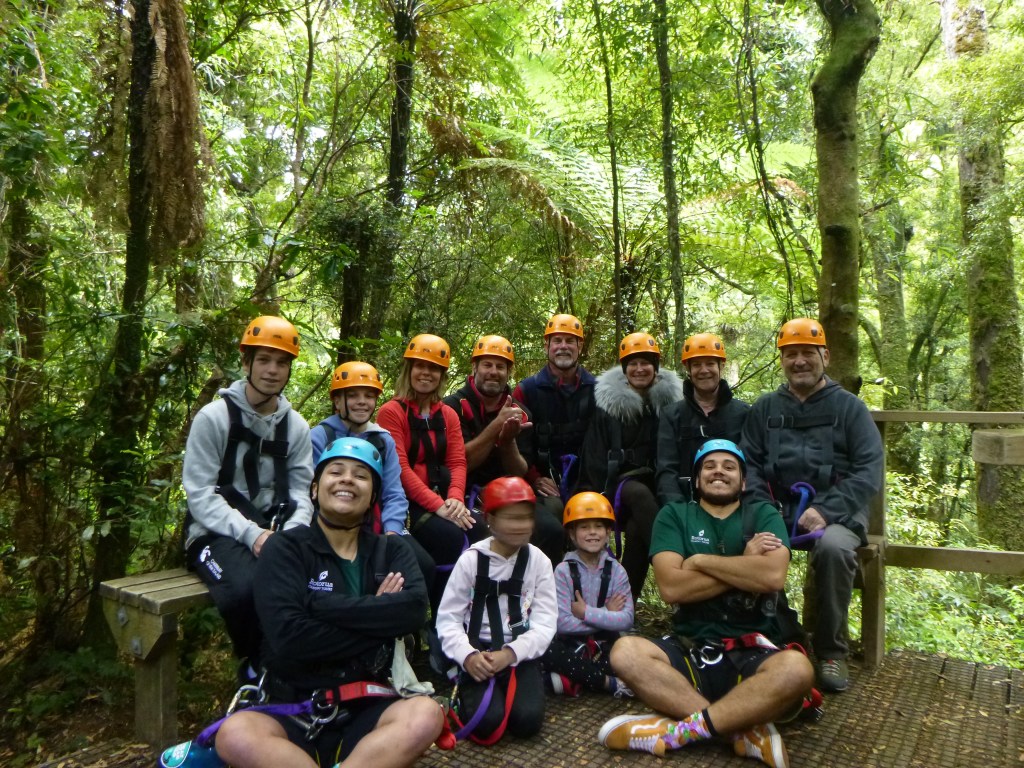 Le lendemain matin, nous avions une attraction de prévue : le « Rotorua Canopy Tour ». Il s’agit d’un parcours dans la forêt primitive à proximité de Rotorua. Un peu de marche à pied, ponctuée d’explications sur la faune et la flore locales, quelques escaliers et c’est la 1ère tyrolienne. Il y en aura 6 ainsi que 2 ponts de singe, se situant presqu’à la cime des arbres, à une vingtaine de mètres de haut. La tyrolienne la plus longue faisait quand même 400 m… Ca nous a bien plut et nos jeunes accompagnateurs étaient compétents, efficaces et sympathiques.