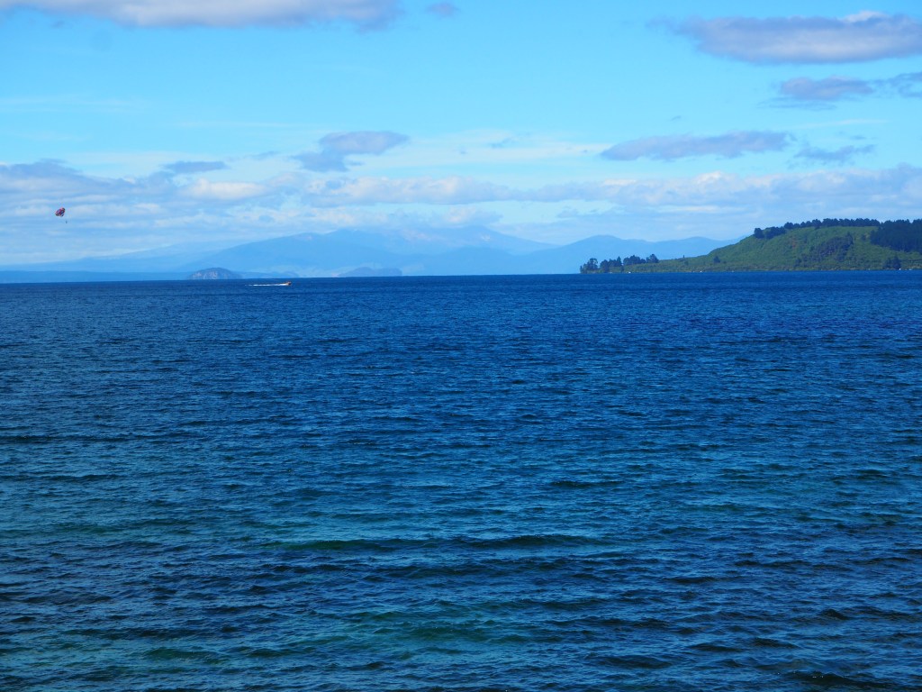 Le lendemain, un trajet sans histoire qui nous mène de Rotorua vers la capitale Wellington. Il n’y a pas d’autoroutes en Nouvelle-Zélande si ce n’est en zone urbaine, autour des plus grandes villes. Il faut 7 heures pour avaler les 400 km qui séparent les 2 villes. Beaucoup de camions sur cette route, mais comme nous roulons tous à la même vitesse, ils ne sont pas réellement gênants. Taupo est un must. Le lac est magnifique. Il s’est créé il y à environ 2000 ans dans une caldera (cratère effondré). C’est le plus grand lac de Nouvelle Zélande.